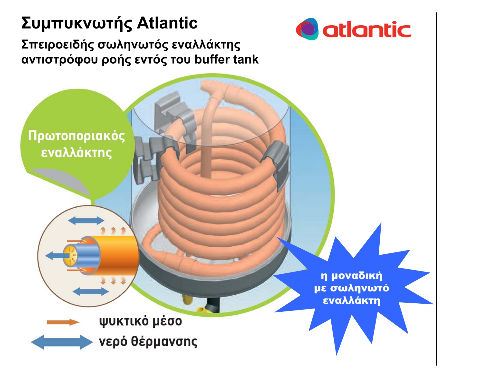 - Εναλλάκτης θερμότητας, στην εσωτερική υδραυλική μονάδα, σωληνωτός αντιστρόφου ροής με πολύ μεγάλη επιφάνεια εναλλαγής, πρωτοποριακής σχεδίασης εμβαπτισμένος σε ανοξείδωτο δοχείο αδράνειας 16 lt.